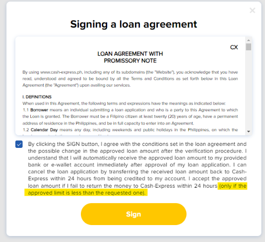 By pressing SIGN, you are officially saying “Yes, I accept the loan agreement.”
